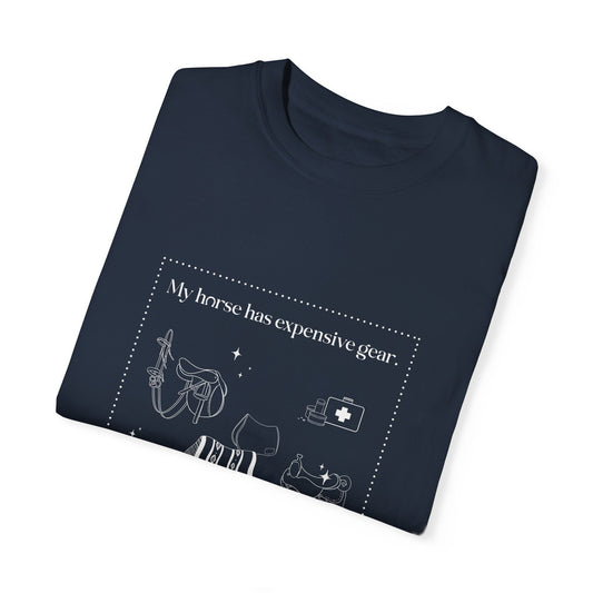 My horse has expensive gear. I have this shirt.